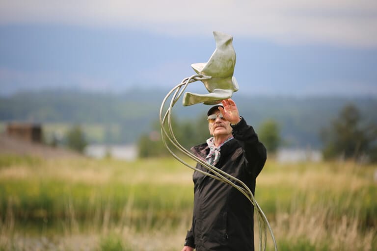 In the early 1970s, Rubinoff moved to a 200-acre farm on Hornby Island in British Columbia, living and working on-site for the next four decades to create the majority of his work. His works range from the human to monumental scale and are created exclusively from welded or cast, stainless and Corten steel. Rubinoff created his sculptures unassisted, and his studio included a one-person steel foundry, which made it possible to cast the organic forms found in his later series. In addition to the sculpture, Rubinoff designed many landscape alterations that have reshaped his property to suit the exhibition of his sculpture.